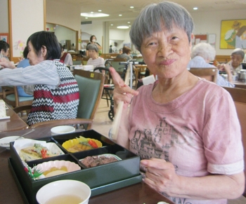 博愛苑で敬老祝賀式典が開催されました。毎年、敬老祝賀式典の日のお昼ご飯は豪華な献立になっており、皆様楽しみにしておられます。お赤飯に天ぷら盛り合わせ、茶碗蒸しなど、美味しい料理が並びます。「茶碗蒸しは大好きや。嬉しいなぁ」、「美味しいもの食べたら長生きできるわ」と話も弾み、楽しい昼食会となりました。皆様、美味しいものを食べて、これからもお元気にお過ごしください。