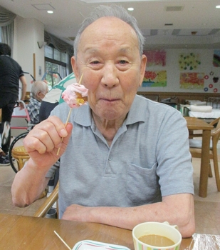 敬老週間の最終日、3時のおやつに【紅白ベビーカステラ】を作りました。カステラはホットケーキミックスで作った生地をタコ焼き器に流し入れて焼きました。仕上げに生クリームをピンクに色付けしてトッピング。可愛らしいおやつを口いっぱい頬張っておられ、見事完食されていました!