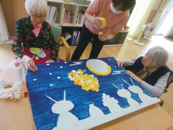 愛宕ケアハウスでは、『秋の作品展』に向けてキャップアートを制作しています。ペットボトルのキャップを綺麗に洗って、乾かし、色別に分けて、下絵に貼り付けていきます。夏前からコツコツ進めてきました。何が出来るかは…、作品展をお楽しみに。秋の主役と来年主役のアレが出てきますよ。