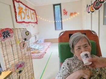 8月末に開催予定だった夏祭りを10月に特養秋祭りとして開催しました。利用者の皆さんも法被を着て準備万端! 千本釣りやわなげでは、お菓子が景品。何が釣れるか楽しみに糸を引っ張っておられました!ホールの壁には花火の映像、ベランダで焼き芋!焼きあがったホクホクのお芋にバターやはちみつをかけて美味しくいただきました。