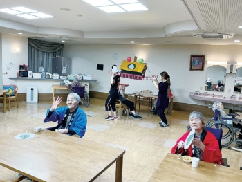 秋祭りの続きです。お祭りといえば…お神輿! ダンボールで作成したお神輿をお祭り当日にお披露目し、秋祭り終盤で担ぎながらホールや居室を練り歩き、「ワッショイ!ワッショイ!」利用者の皆さんからは「わぁーすごいなぁ!」と歓声が上がり、たくさんの笑顔が見られました。