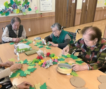 クリスマスに向けて皆さんと一緒にクリスマスリースの作成に取り掛かりました。段ボールの土台、折り紙で作った葉、お花飾り、キラキラのシール、色鮮やかなリボンを準備して皆様に作っていただきました。土台に葉をつけ「黄色の花がほしいけどある?」「色合わせが難しいな」など皆さん真剣に取り組まれていました。出来上がると「これ良いやろ」と満足そうな表情をされ、居室の扉に飾りユニット内はクリスマスの雰囲気に包まれました。