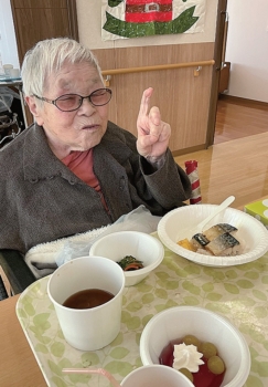 本日の昼食は誕生日メニューでした。焼き鯖寿司、ホウレンソウのわさび和え、赤だし、ぶどうゼリーと彩り豊かな献立です。その中でも焼き鯖寿司は身が分厚く脂ノリが良く「おいしかった」「また食べたいな」など大変好評でした。また、ぶどうゼリーも人気で「甘いの大好き」など満足されていました。皆様に喜んでいただける食事作りを今後も大切にしてまいります。