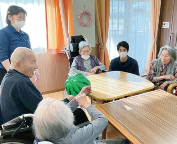 ご利用者の皆様と一緒にボールバレーを行いました。軟らかいボールを使い無理のない動きで楽しく体を動かしました。ラリーが続くと「ほれ!」「よいしょ!」と元気な掛け声も飛び交い活気にあふれていました。心身のリフレッシュにつながる和やかなひと時になりました。今後も楽しみながら参加できるレクリエーションを大切にしてまいります。