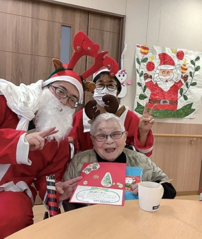 「特養クリスマス会」を行いました。職員がサンタに扮し、手作りそりやトナカイと共に出発しました。クリスマスソングと共にサンタが登場すると、皆さん大盛り上がり。サンタからクリスマスプレゼント、メッセージカードを貰い、笑顔が溢れました。一人ずつ記念写真も撮り、クリスマスの雰囲気を満喫できました。おやつには、クリスマス仕様のロールケーキ。「楽しい。甘くて美味しかったわ」と皆さん、喜んでおられました。また来年のクリスマスをお楽しみに。