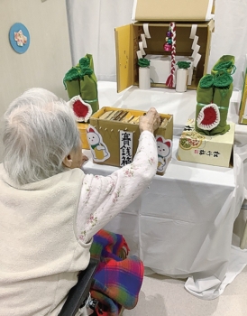 お正月から3日間は、午後からお正月レクを実施しました。書初め、愛宕手作り神社参拝、新春歌謡曲TV鑑賞の豪華3本立て。書初めでは、「久しぶりに筆を持ったわ」と話され、お手本を見ながら、ゆっくりと書いておられました。愛宕神社参拝では、お賽銭を入れ、ゆっくりと手を合わせた後、おみくじも引き、今年の運を占いました。歌謡曲鑑賞では、懐かしい歌手の方がたくさん出演され、皆さん口ずさんだりしながら聞き入っておられました。