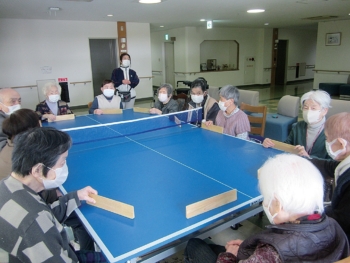 レクリエーションの時間に卓球バレーをしました。雪がチラチラと降り始める寒い日でしたが、入居者の皆様は「体を動かして暖かくなろう!」と張り切っておられました。6人対6人のチーム戦で行われ、白熱した試合展開となりました。1点が入るごとに「やったー!」の歓声と、「次は頑張って1点取ろう!」と励ましあう声が飛び交い、賑やかな時間となりました。