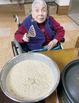 本日のおやつ作りは『キャベツ焼き』を作りました。「これ何や?お好み焼きか?」「いえ、キャベツ焼きですよ!」というコントのようなやりとりを繰り返しながら、美味しいキャベツ焼きが完成しました。お味も好評で、皆さん「美味しい、美味しい」と召し上がられました。