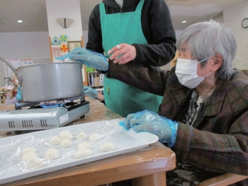 3時のおやつに【白玉ぜんざい】を作りました。手際よく団子をきれいな形に丸め、とても美味しそうなぜんざいが出来上がりました。寒い日に食べる温かいぜんざいは好評で、皆さん完食されていました。