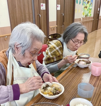 「なんか美味しんもん食べたい」との声にこたえて『三条のいろは』様でお肉を購入し、すき焼きパーティーを開催しました。野菜を皆さんに切っていただき、砂糖や醤油を入れる順番を教えてもらい、いよいよお肉が出てくると「美味しそう」と歓喜の声が上がり、出来上がりのすき焼きを食べていただくと「美味しいわぁ!やわらかい」と皆さんぺろっと完食されました。美味しい食事は、体だけでなく心も元気にしてくれます。これからも皆様の食べたいという意欲を大切に五感で楽しめる行事を企画してまいります。