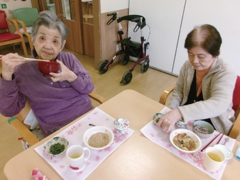 今月のお誕生日献立は、①赤飯②春野菜の炒り鶏③菜の花のゴマ和え④茶碗蒸し⑤ロールケーキでした。一番人気は茶碗蒸し、皆様の大好物です。「茶碗蒸しが出ると特別な感じがするなぁ」と言われています。続いてロールケーキ「甘いものは大好き」と喜ばれています。お食事を美味しくいただけるのは健康の証。皆様いつまでもお元気で!3月お誕生日の方、おめでとうございます。