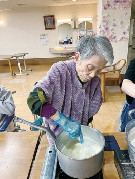 今日のおやつ作りは『ミルク餅』でした。「初めて作るわ」と言われながらも、手慣れた手つきでお鍋をクルクルされていました!段々お餅が固まり始めると「おぉ!出来てきたで!」と声が上がり、生地を伸ばす係にバトンタッチです♪伸ばした生地を冷やして固め、ひんやり美味しいミルク餅が完成しました。