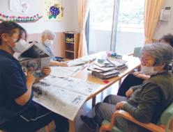 只今愛宕ケアハウスにはYMCAより実習生が介護の現場を学びに来られています。この日は手先の器用なご利用者の方から、新聞紙で折る『紙コップ』の作り方を教わりました。新聞で作る紙コップは大きくて、ゴミ受けやごみ袋代わりになり、愛宕ケアハウスではとても重宝しています。