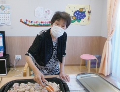 なでしこユニットでは「パリパリチキンソテーに梅肉ネギソース」作りに挑戦しました。鶏もも肉に下味をつけて、ホットプレートで焼き、梅肉ネギソース(何だか美味しそうなネーミングですね)をかけて頂きます。皆様慣れた手つきで調理が進みます。栄養士さんも加わり、楽しく調理しました。