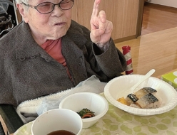 本日の昼食は誕生日メニューでした。焼き鯖寿司、ホウレンソウのわさび和え、赤だし、ぶどうゼリーと彩り豊かな献立です。その中でも焼き鯖寿司は身が分厚く脂ノリが良く「おいしかった」「また食べたいな」など大変好評でした。また、ぶどうゼリーも人気で「甘いの大好き」など満足されていました。
