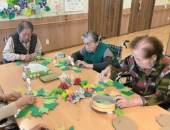 クリスマスに向けて皆さんと一緒にクリスマスリースの作成に取り掛かりました。段ボールの土台、折り紙で作った葉、お花飾り、キラキラのシール、色鮮やかなリボンを準備して皆様に作っていただきました。土台に葉をつけ「黄色の花がほしいけどある?」「色合わせが難しいな」など皆さん真剣に取り組まれていました。