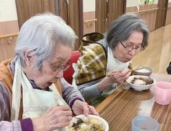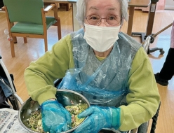 春のクッキングで餃子作りをしました。皆さん、エプロン、マスク、手袋を装着し調理準備万端!野菜、お肉をボールに入れ混ぜていきました。餃子の具材が完成し、次は60 個の餃子の皮包み、手際よく皮に具を入れていき、「美味しそうに包めた」「早く食べたい」と声が出ました。