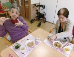 今月のお誕生日献立は、①赤飯②春野菜の炒り鶏③菜の花のゴマ和え④茶碗蒸し⑤ロールケーキでした。一番人気は茶碗蒸し、皆様の大好物です。「茶碗蒸しが出ると特別な感じがするなぁ」と言われています。続いてロールケーキ「甘いものは大好き」と喜ばれています。お食事を美味しくいただけるのは健康の証。