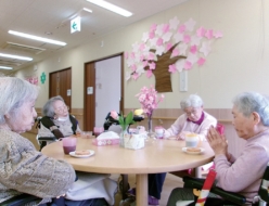 「あじさいユニット、お楽しみ喫茶」を開催しました。今月のスィーツは、シャトレーゼさんの『バウムクーヘンすこやかの樹桜』、皆様とても美味しそうに召し上がられました。壁画の桜の木の下でまるで花見のようですね。今月も甘く楽しい時間を過ごされました。