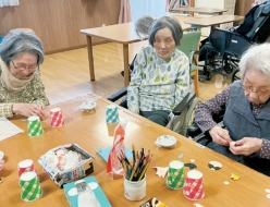 午後のひと時の時間に塗り絵を行いました。題材は給食のメニュー、花、季節の出し物を選びました。皆さん集中され、細かい部分まで丁寧に塗っておられました。「久しぶりに塗ったで、肩がこったわ。綺麗に塗れたわ」と楽しまれていました。ゆっくりと塗る事ができ、たくさんの作品が完成しました。