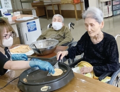 今月のおやつ作りは『キャベツ焼き』でした!ホットプレートの上で焼ける生地に、食欲をそそる美味しい香りがしてきます。さて、皆さん上手に生地をひっくり返せるか?腕の見せ所です! 失敗してもご愛敬。皆さん上手にひっくり返され、ワイワイと楽しみながら、美味しいキャベツ焼きができました。