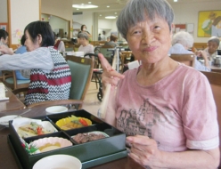 9月15 日(月)は敬老の日。皆様おめでとうございます。敬老の日の1週間前から【敬老週間】と称し、おめでたいレクリエーションを皆様と楽しみました。特に喜んで頂けたのが昼食の松花堂弁当です。笑顔いっぱい!お腹いっぱい!大好評の昼食でした。
