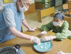 お菓子が大好きな入居者様が集まって、お菓子作りが開かれました。今回挑戦するのは「フルールポンチ」です。まずは白玉粉に蜜を混ぜてよくこねて、型をとっていきます。白玉を茹でて、フルーツとサイダーに加えたら出来上がりです。