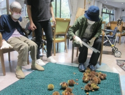 ケアハウスの職員がお家でとれたイガ付きの栗を持ってきてくれました。入居者の皆様は大喜びで「みんなで栗を取ろう!」ということになりました。イガのとげで怪我をしないように注意を払って火箸で取り出していきます。「足を使って慎重に取り出すんやで」、「わぁー、大きい栗やなぁ」と皆様笑顔で楽しまれました。