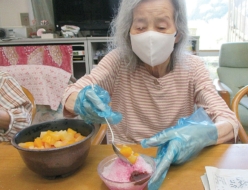 8月4日(月)~9日(土)は「夏祭り週間」でした。今年は、夏祭りのレクリエーションを楽しんだ後に、かき氷を一緒に作り、15時のおやつとしていただきました。氷にシロップをかけ、フルーツとあんこを盛り付け、かき氷が完成。「かき氷食べるん、いつ以来やろ」「冷たくて美味しかった」と喜んでおられました。