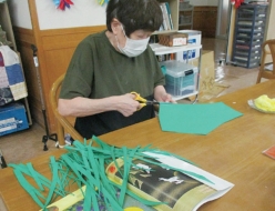 猛暑日が続き、まだ秋も遠い中、デイサービスでは、少しでもご利用者の皆様に秋を感じていただこうと壁画制作に取り組みました。コスモスのリースとお月見を制作。コスモスのリースは折り紙とお花紙、お月見は模造紙と画用紙とお花紙を使用しました。「もう秋が近づいて来たんやな。早いな。