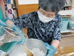 今回のおやつ作りレクリエーションは【わらび餅】に挑戦しました。鍋にわらび粉と砂糖と水を入れ、皆様と一緒に混ぜ、生地が透明になるまで一生懸命に練りました。生地が出来上がると、数分冷水で冷やした後、生地を一口大に切り、きな粉をかけると【わらび餅】の完成です。皆様から「美味しかった。」と好評でした。