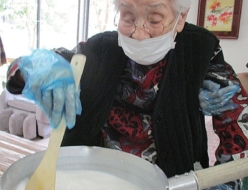 今日のおやつ作りは『ミルク餅』でした。「初めて作るわ」と言われながらも、手慣れた手つきでお鍋をクルクルされていました!段々お餅が固まり始めると「おぉ!出来てきたで!」と声が上がり、生地を伸ばす係にバトンタッチです♪伸ばした生地を冷やして固め、ひんやり美味しいミルク餅が完成しました。
