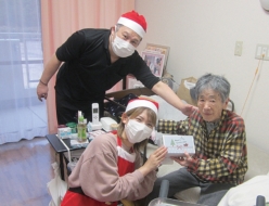 クリスマス会を開催しました。職員によるピアノ演奏を聴きながら、皆様、お菓子バイキングを楽しまれました。「今日はお菓子食べ放題やなー」とやや興奮気味の方もおられました。その後、雪玉ボーリングに挑戦!「がんばってー」の声援を受けながら、赤い帽子を被り、ストライク目指して頑張りました。