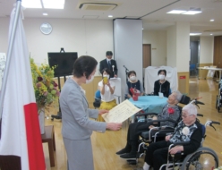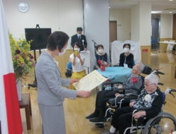 博愛福祉会では、9月11 日(木)に「グリーンプラザ博愛苑」で、9月12 日(金)に「グリーンパーク愛宕」で、それぞれ「敬老祝賀式典」を開催いたしました。 今年は、3名もの方に100歳のお祝いをすることができました。